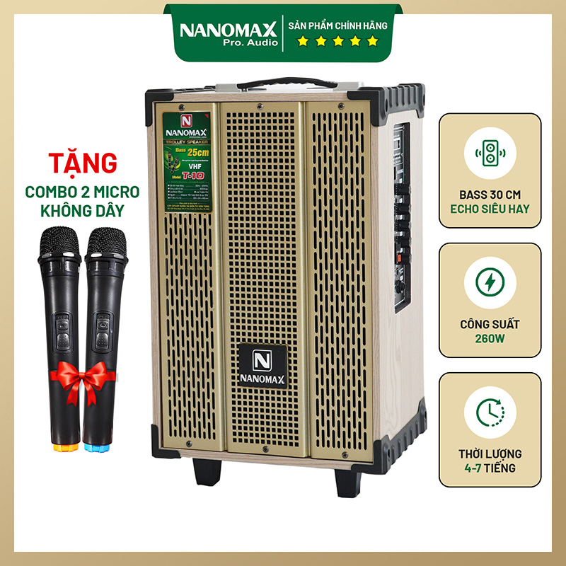 Nanomax T-10 là phiên bản loa karaoke mini Thùng trắng, được trang bị 2 micro VHF có kích thước nhỏ gọn thiết kế cổ điển. Sở hữu công suất 200w, loa 2 đường tiếng gồm 1 bass 25cm và 1 treble, Nanomax T10 phù hợp hát karaoke trong phòng có diện tích vừa và nhỏ.